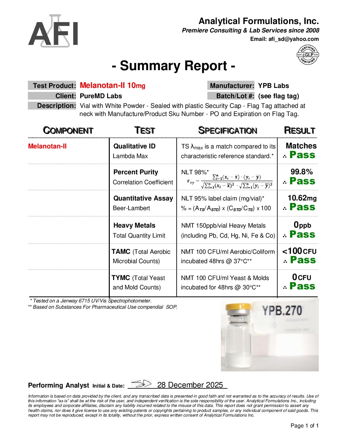 Packaging: Tamper-evident seal with lot number and test date on each vial