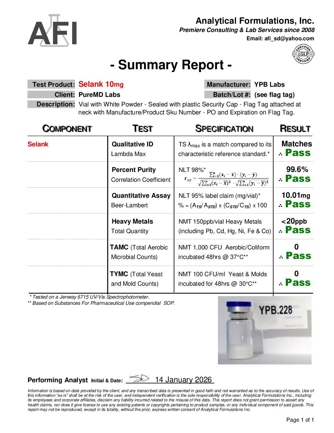 Selank (10 mg) is a single-component, research-grade compound supplied exclusively for controlled laboratory environments. This material is intended for non-clinical research applications involving compound characterization, analytical validation, and method development within model-system frameworks. The lyophilized format supports stability, reproducibility, and consistency across advanced research workflows. Each vial is HPLC/LC-MS verified to ensure ≥ 99% purity, providing reliable performance, reproducibility, and traceability across advanced analytical and research applications.